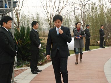 11月29日60余名擎天隊(duì)員脫下制服換上西裝,整裝待發(fā)。10點(diǎn)準(zhǔn)時(shí)到達(dá)活動(dòng)目的地---“華麗家族-太上湖”項(xiàng)目地。隊(duì)員下車(chē)后排成了整齊的方隊(duì),統(tǒng)一的服裝,整齊的步伐,帥氣的面孔,響亮的口號(hào)吸引住了所有人的目光。